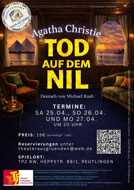 Das freie Ensemble "Theater. Aus Gründen." (Leitung und Regie: Hannah Sophia Küpper) zeigt am 25., 26. und 27. April um jeweils 20:00 Uhr Agatha Christies "Tod auf dem Nil" im Theaterpädagogikzentrum in der Reutlinger Heppstraße. In dem spannenden Krimi treffen Kay und Simon Mostyn während ihrer Flitterwochenreise in Ägypten immer wieder auf Jacqueline de Severac, die die ehemals beste Freundin von Kay und nun Simons Ex-Geliebte ist. Auch der letzte verzweifelte Versuch, Jacqueline abzuhängen misslingt: Kay, Simon und Jackie finden sich plötzlich zu dritt auf dem Raddampfer "Lotus" wieder und können einander nicht mehr entkommen. Neben ihnen sind noch einige wohlhabende Passagiere mit äußerst eigenwilligen Charakteren an Bord, von denen so manch einer ein eigenes Geheimnis hat...Da sind Spannungen und Konflikte vorprogrammiert. Es dauert nicht lange, bis die Stimmung kippt und ein erster Schuss fällt...