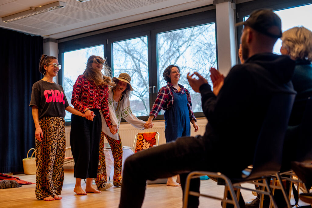 Es wurde deutlich, wie die Gruppe mit sichtbarer Freude und großer Kompetenz die verschiedenen methodischen Ansätze der Werkstätten zusammenführt und im gemeinsamen Prozess in praktische Theaterarbeit übersetzt.